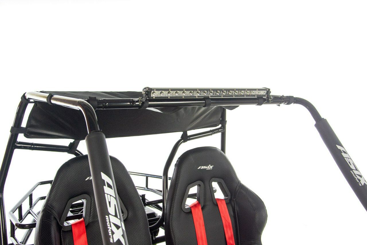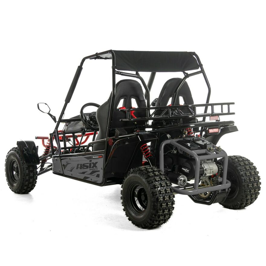 Napęd ASIX Buggy 200 oparty jest na czterosuwowym silniku o pojemności ok. 200 cm³, chłodzonym powietrzem. Jednostka jest dynamiczna i przewidywalna, co przekłada się na płynne przyspieszenie i stabilną moc — idealną do jazdy rekreacyjnej, terenowej zabawy oraz spacerów z pasażerem.