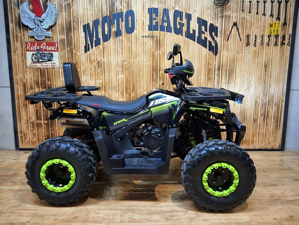 Quad Ranger to pojazd dla młodzieży i dorosłych. Napędza go czterosuwowy silnik o pojemności 250cm³ zestrojony z automatyczną skrzynią biegów. Duży, przeprawowy model wyposażony w oświetlenie LED, licznik elektroniczny, handbary, lusterka, oparcie oraz hydrauliczne hamulce tarczowe