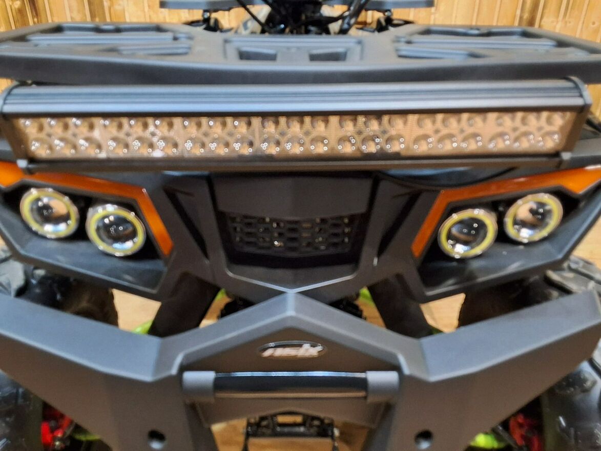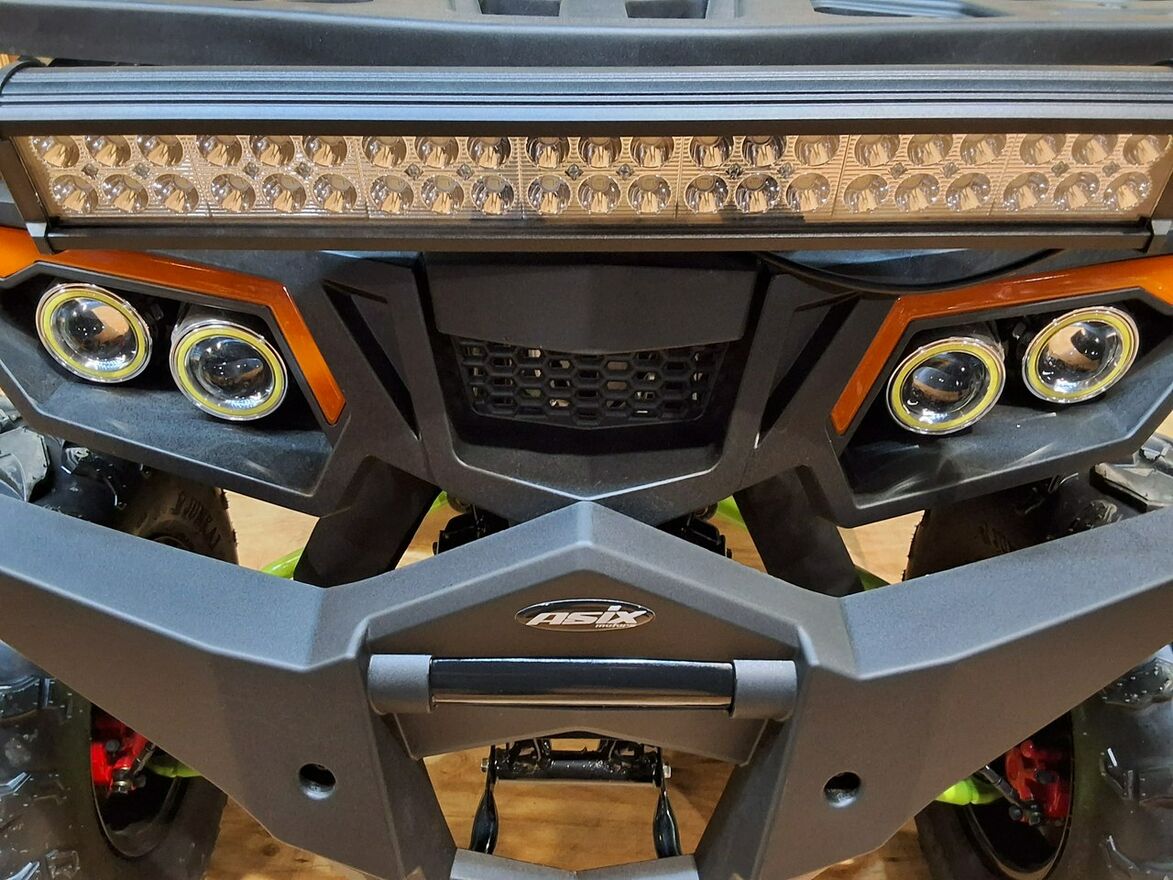Wielowahaczowe zawieszenie przednie na sworzniach kulowych wyposażone w regulowane amortyzatory olejowe zapewniają pełną kontrolę nad pojazdem. Płynna praca zawieszenia przy zachowaniu odpowiedniej przyczepności pozwoli w pełni cieszyć się pokonywaniem bezdroży