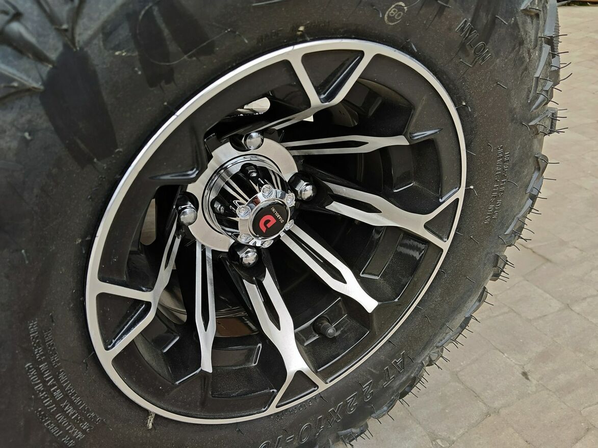 Duże opony terenowe zamontowane na aluminiowych felgach poprawiają przyczepność oraz stabilność podczas jazdy po luźnej nawierzchni.