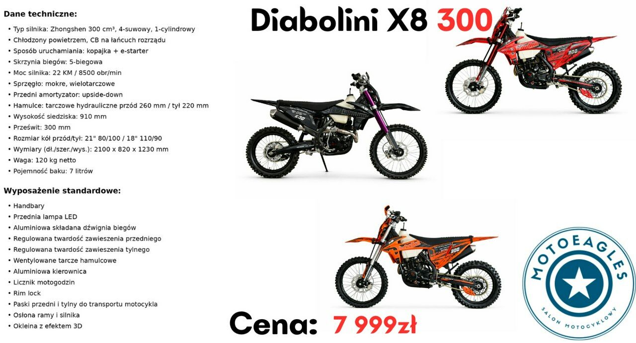 Diabolini X8 300 to cross terenowy dla osób, które szukają mocnego motocykla do jazdy off-road. Dzięki sprawdzonej konstrukcji, dużym kołom terenowym i solidnemu silnikowi motocykl dobrze sprawdza się zarówno podczas rekreacyjnej jazdy w terenie, jak i bardziej dynamicznej jazdy off-road.