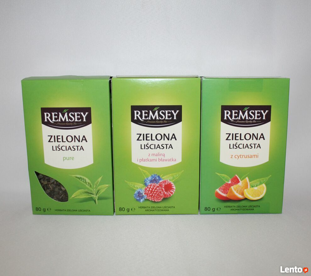 Remsey herbata zielona liściasta. Dwa smaki - zwykła albo z cytrusami . Opakowanie 80g. Długi termin ważności. Mam dużo. Szybka wysyłka do paczkomatu Inpost. Podaję linki gdzie można zakupić z wysyłką:https://allegro.pl/uzytkownik/SklepNikiforek