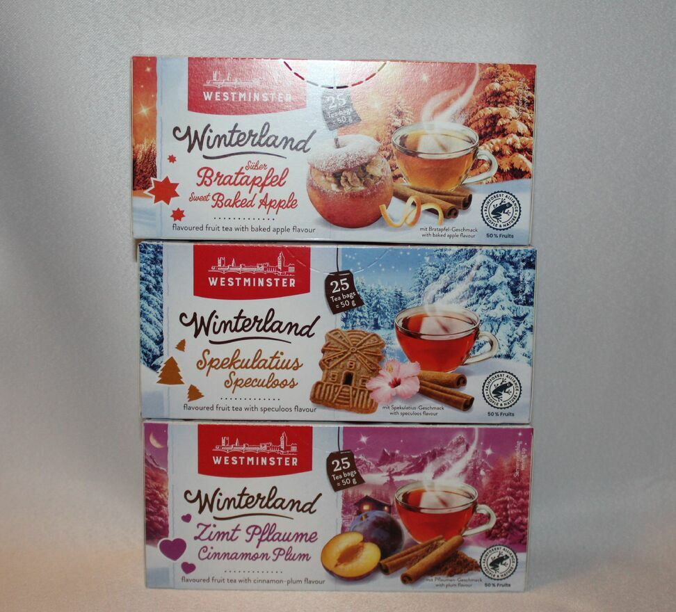 Westminster herbata owocowa, zimowa "Winterland" o smaku pieczonych jabłek z cynamonem i skórką pomarańczy, śliwki z cynamonem albo ciasteczkowa. Ekspresowa 25 torebek w opakowaniu 50g. Mam też zimowe herbaty innych marek - zimowe smaki Lorda Nelsona, zimową fantazję z Malwy oraz pierniczkową herbatę z Astry i można sobie u mnie dobrać. Najszybciej pójdzie do paczkomatu Inpost. Podaję linki gdzie można zakupić z wysyłką:https://allegro.pl/uzytkownik/SklepNikiforek