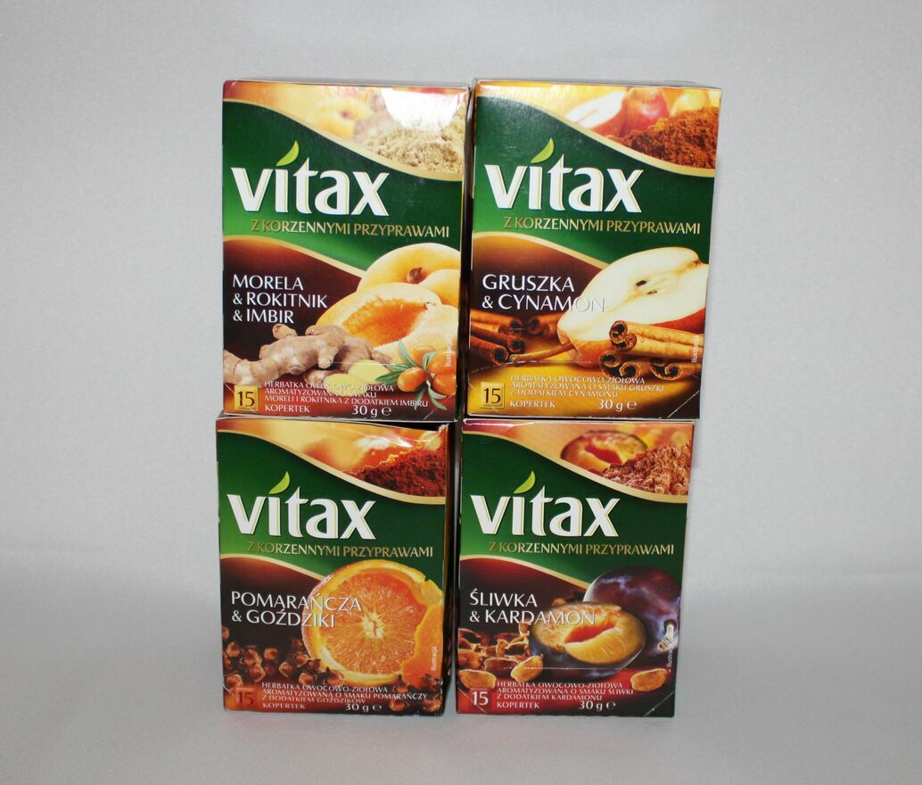 Herbata korzenna , zimowa vitax. 15 torebek w opakowaniu. Cztery smaki do wyboru: pomarańcza z goździkami, gruszka z cynamonem, śliwka z kardamonem i morela. Podaję linki gdzie można zamówić z wysyłką:https://allegro.pl/uzytkownik/SklepNikiforek