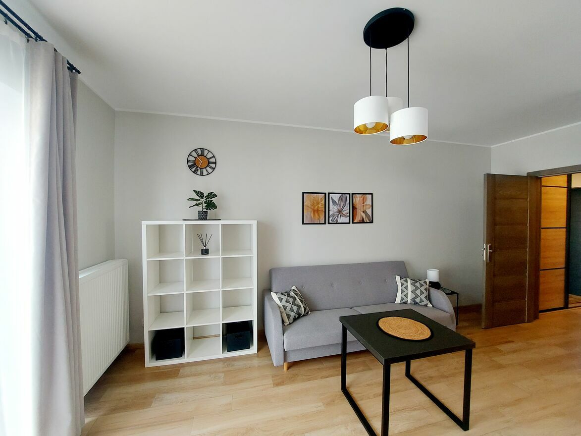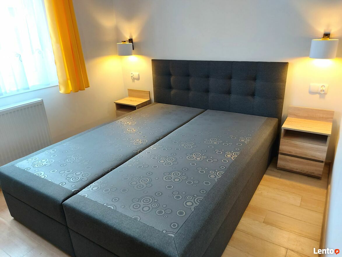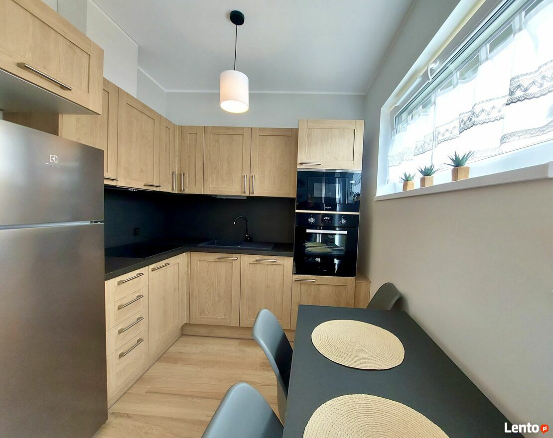 Mieszkanie jest całkowicie wyposażone w funkcjonalne nowe meble, wygodne łóżko z nowymi materacami (duże łóżko dwuosobowe o szer. 160 cm z dwoma materacami i rozkładana sofa). Zabudowa kuchenna, duża szafa w korytarzu oraz drzwi wewnętrzne o szer. 90 cm z litego jesionu wykonane pod wymiar. Drzwi zewnętrzne z zamkiem antywłamaniowym. Na wszystkich oknach są zamontowane rolety zewnętrzne. Mieszkanie wyposażone jest w wysokiej klasy sprzęt AGD: lodówkę, zmywarkę do naczyń, piekarnik, płytę indukcyjną, kuchenkę mikrofalową , pralkę i TV. Do wykorzystania jest też poddasze nieużytkowe z wejściem przez właz z rozkładanymi schodami.