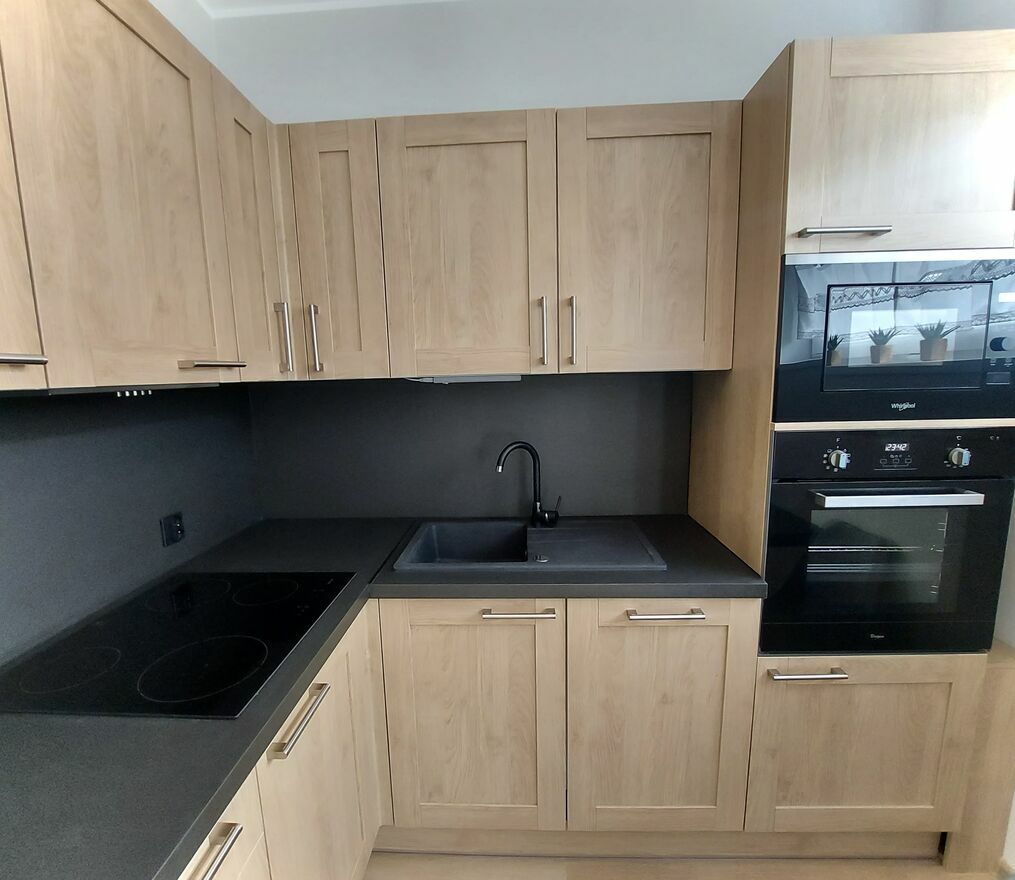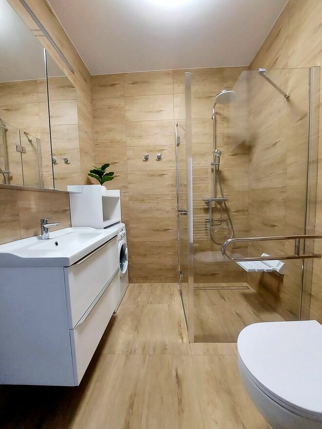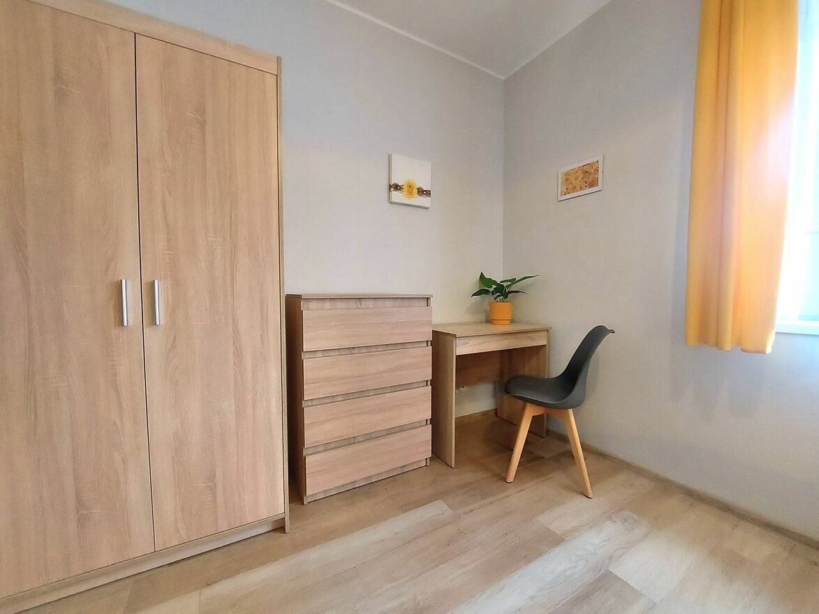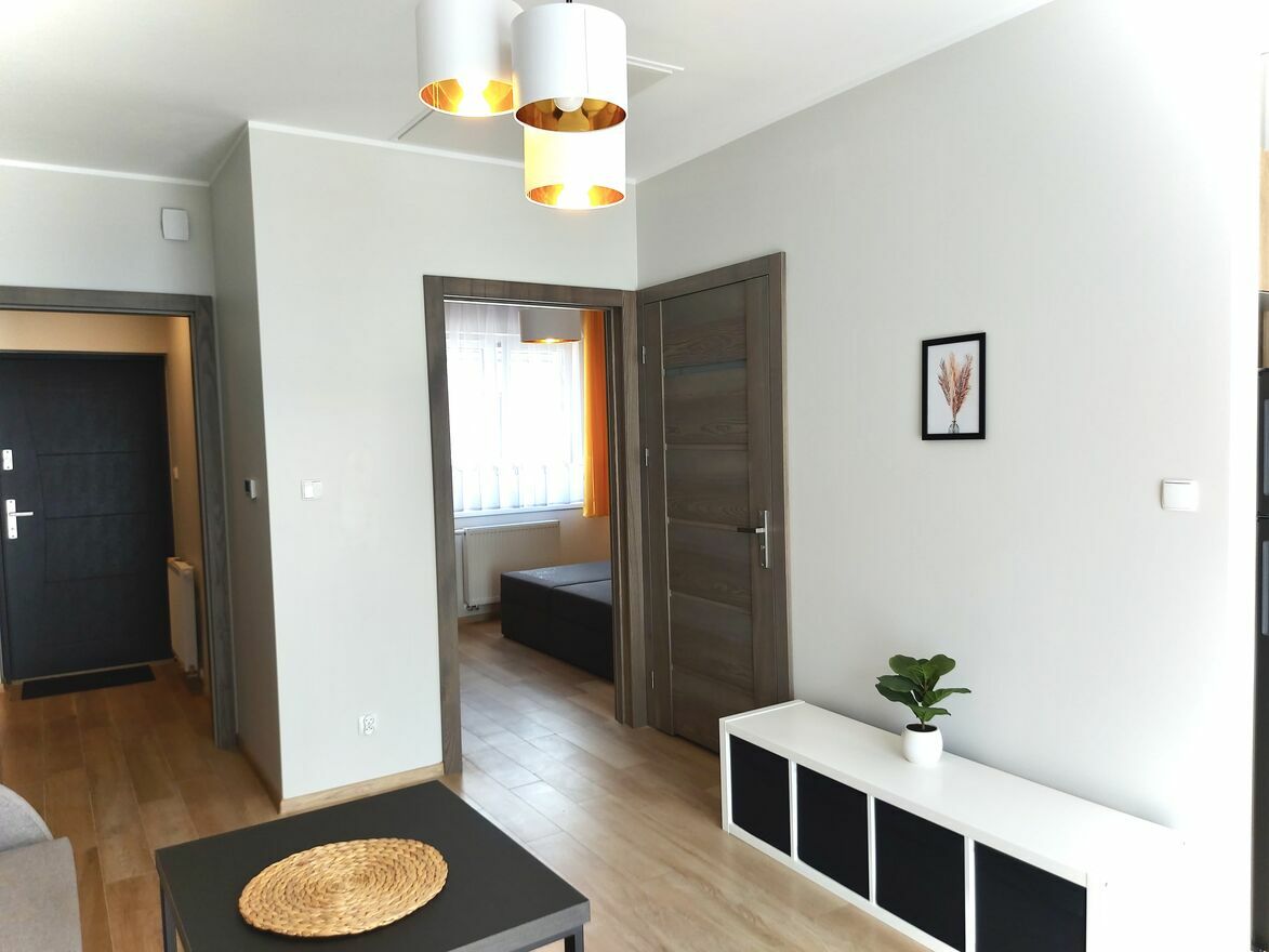 Mieszkanie jest całkowicie wyposażone w funkcjonalne nowe meble, wygodne łóżko z nowymi materacami (duże łóżko dwuosobowe o szer. 160 cm z dwoma materacami i rozkładana sofa). Zabudowa kuchenna, duża szafa w korytarzu oraz drzwi wewnętrzne o szer. 90 cm z litego jesionu wykonane pod wymiar. Drzwi zewnętrzne z zamkiem antywłamaniowym. Na wszystkich oknach są zamontowane rolety zewnętrzne. Mieszkanie wyposażone jest w wysokiej klasy sprzęt AGD: lodówkę, zmywarkę do naczyń, piekarnik, płytę indukcyjną, kuchenkę mikrofalową , pralkę i TV. Do wykorzystania jest też poddasze nieużytkowe z wejściem przez właz z rozkładanymi schodami.